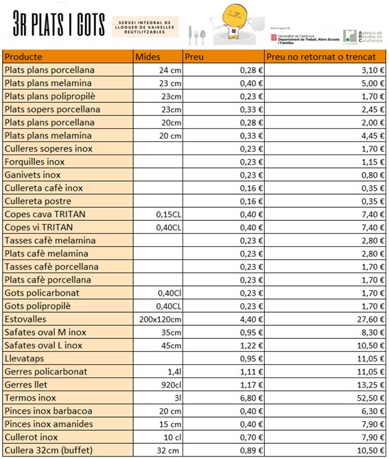 - La vaixella s’ha de tornar com a màxim 2 dies hàbils després de l’esdeveniment. Per cada dia excedit de la data límit de retorn es cobraran 10 €.